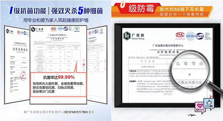 抗菌率達99.99% ,有效滅殺,肺炎克雷伯氏菌、鼠傷寒沙門氏菌、大腸桿菌、黃色葡萄球菌、白色念珠菌等5種細菌等5種常見細菌。
