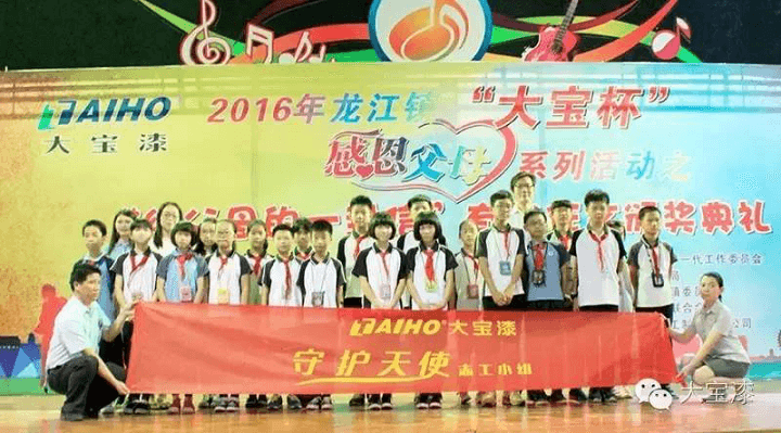 5月20日,由佛山龍江鎮(zhèn)教育局、龍江鎮(zhèn)關(guān)心下一代委員會(huì)與大寶漆共同主辦的2016年龍江鎮(zhèn)“大寶杯”感恩父母系列活動(dòng)之“給父母的一封信”有獎(jiǎng)?wù)魑念C獎(jiǎng)典禮在龍江鎮(zhèn)城區(qū)中心小學(xué)舉辦。佛山龍江鎮(zhèn)教育局和龍江鎮(zhèn)關(guān)心下一代委員會(huì)在頒獎(jiǎng)典禮上授予大寶漆“博愛(ài)慈懷熱心公益”稱號(hào)。大寶化工企劃部楊忠榮副理、龍江鎮(zhèn)關(guān)心下一代工作委員會(huì)麥煥橋主任、獲獎(jiǎng)小學(xué)生及其家長(zhǎng)出席了本次頒獎(jiǎng)典禮。