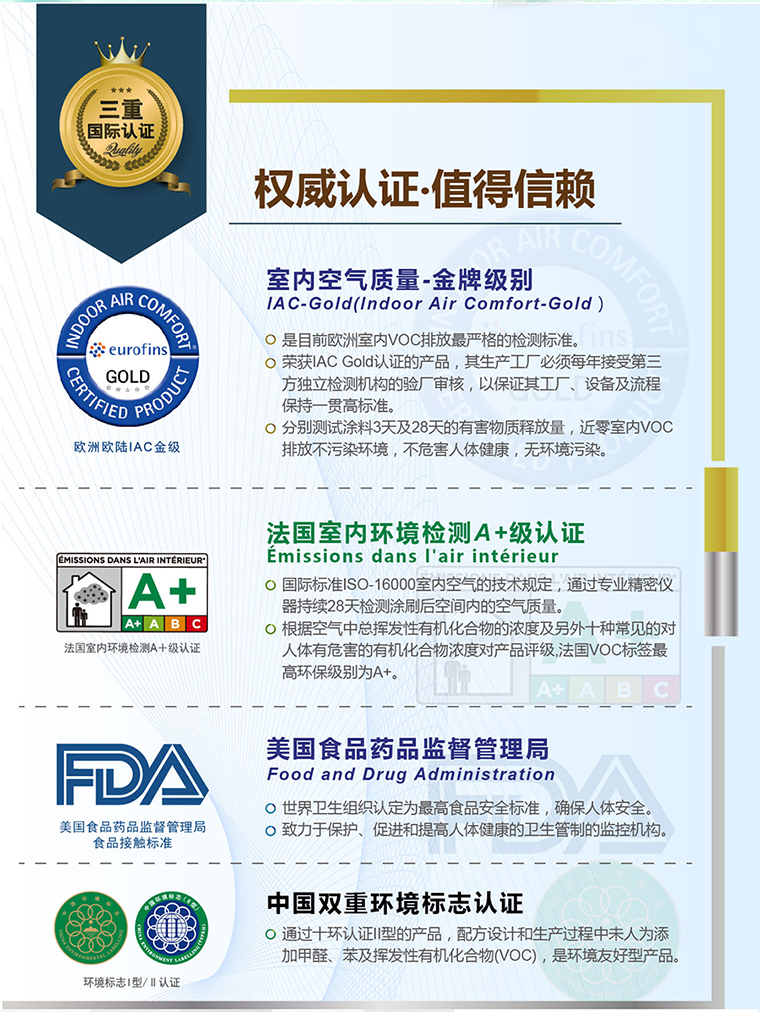 大寶零純+植物抗菌墻面漆取得歐陸歐陸IAC金級、法國A+、美國FDA得三重國際認證;中國環境標志認證,及24小時室內空氣質量檢測達到法國A+級環保檢測,為有快速入住需求的消費群體提供高環保性能,產品無憂之選。