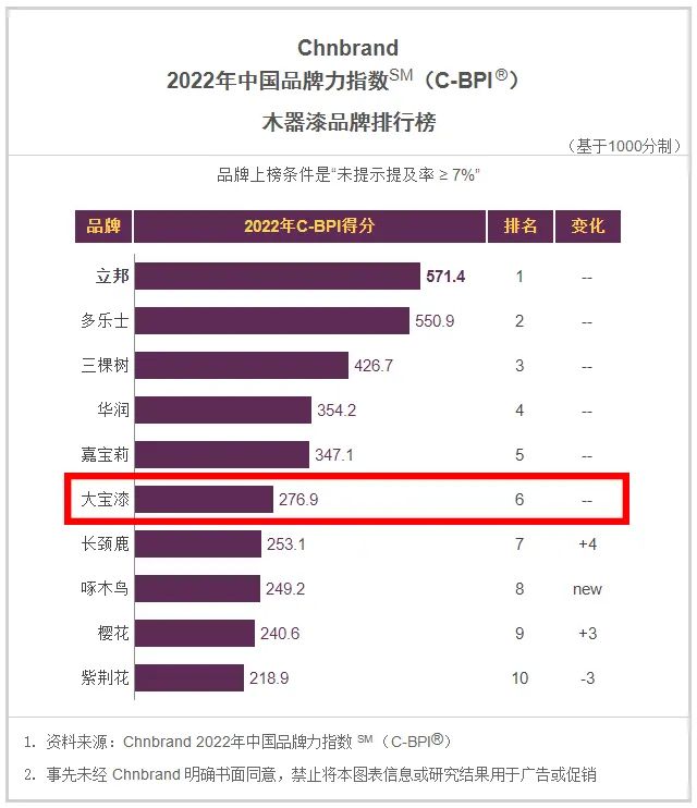 4月20日,品牌評級權(quán)威機構(gòu)Chnbrand發(fā)布2022年(第十二屆)中國品牌力指數(shù)SM(C-BPI®)品牌排名和分析報告,大寶漆再次憑借優(yōu)質(zhì)、環(huán)保的產(chǎn)品與深厚的研發(fā)實力和口碑上榜。