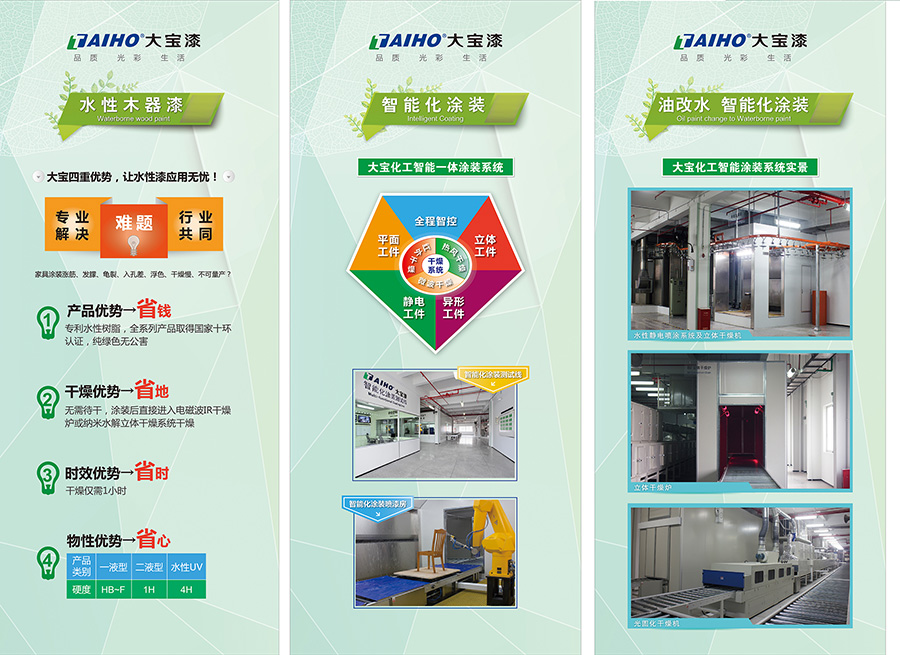大寶漆經(jīng)過多年的技術(shù)專研,打造出了水性內(nèi)外墻面漆、水性木器漆等綠色環(huán)保產(chǎn)品,并推出水性木器涂料整體解決方案,針對家居行業(yè)面對水性漆干燥難題,斥巨資率先打造中國涂料行業(yè)首條大規(guī)模的智能化水性涂裝測試線,以便滿足客戶的立體工件、平面工件、異型工件等涂裝與干燥的多元化需求,一舉攻破行業(yè)油改水涂裝和干燥的重重難關(guān),領(lǐng)先行業(yè)實(shí)現(xiàn)了家具廠環(huán)保自動(dòng)化涂裝的可能性,為家具企業(yè)油改水的跨越做出了貢獻(xiàn)。