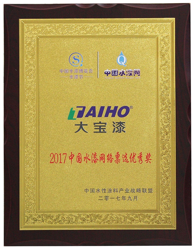 此次大寶漆在水博會中獲得了“2017中國水漆網(wǎng)絡(luò)票選優(yōu)選獎”,這是消費者對大寶水性漆及倡導(dǎo)的環(huán)保涂裝方案的充分肯定,同時也是對大寶漆在推動環(huán)保水性涂料發(fā)展方面的鞭策。