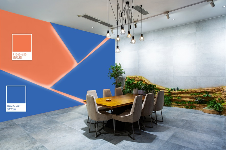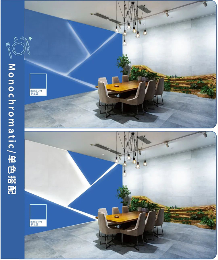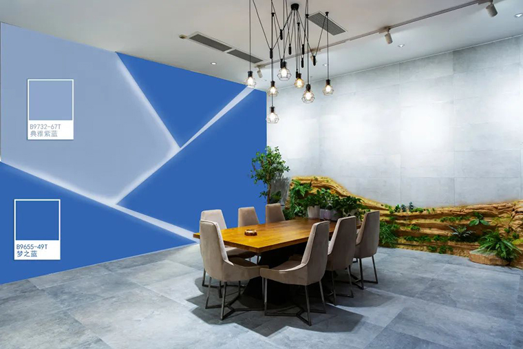 因為藍色讓人明顯降低食欲。Pantone色彩研究所Leatrice Eiseman說過:藍色可以很好地表現出恒定和信任感,也能呈現出時髦的現代風格。所以今天大寶色彩研發團隊將通過夢之藍B9655-49D色系搭配,在餐廳中使用藍色,擺脫「藍色魔咒」!