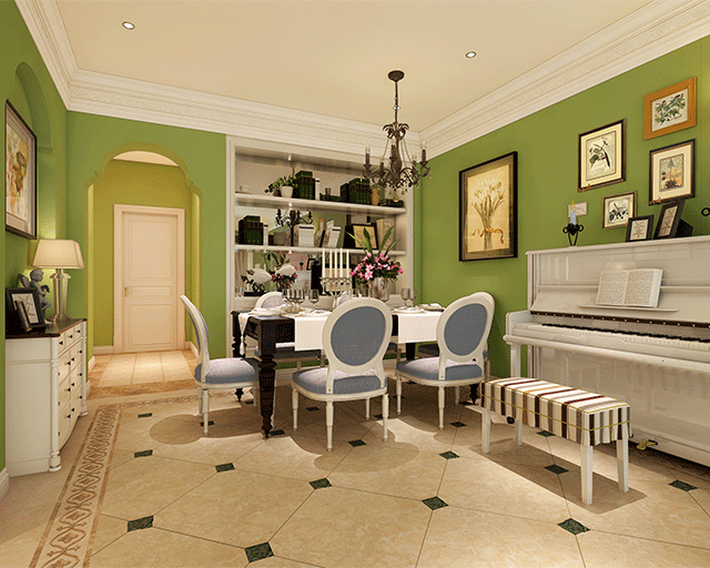 歐式田園風(fēng)格在設(shè)計上講求心靈的自然回歸感,喜歡把一些精細(xì)的后期配飾融入到設(shè)計風(fēng)格之中,體現(xiàn)一種安逸、舒適的生活氛圍。通常大量使用碎花圖案的各種布藝和掛飾,墻壁上也并不空寂,壁畫和裝飾的花瓶都使它增色不少,鮮花和綠色的植物也是很好的點綴。